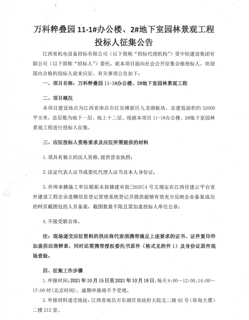 万科粹叠园11-1#办公楼、2#地下室园林景观工程投标人征集公告